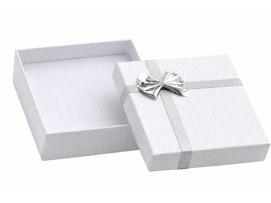 Dárková krabička pro šperkovou sadu – bílá se stříbrnou mašličkou | Elegantní balení 81×81 mm bílé balení pro šperkovou sadu