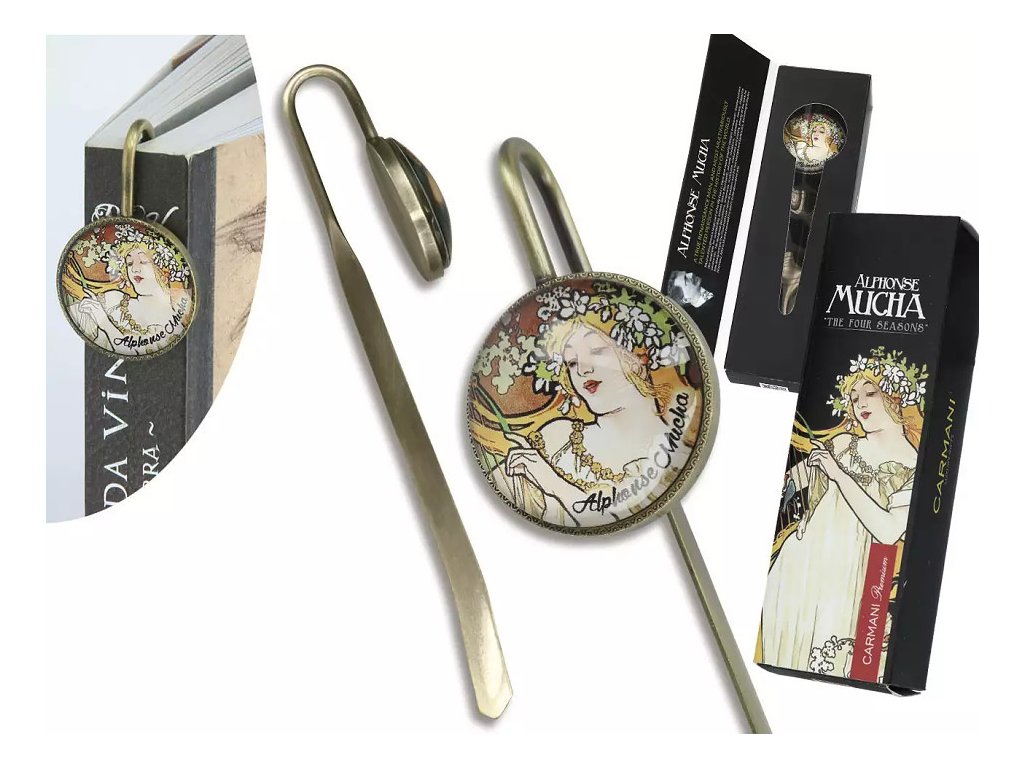 Luxusní kovová záložka s motivem Alfons Mucha – Jaro. Ideální dárek v dárkové krabičce pro milovníky knih a umění.