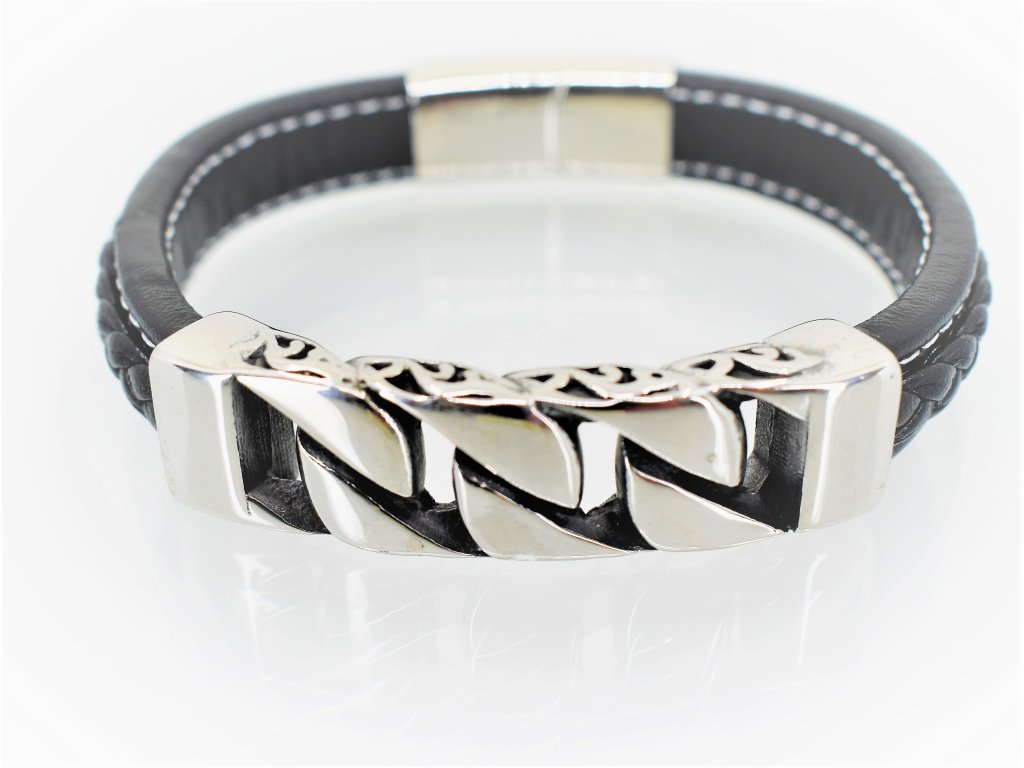 Materiál: chirurgická ocel 316L (lesklý stříbrný odstín) + černá hovězí kůže