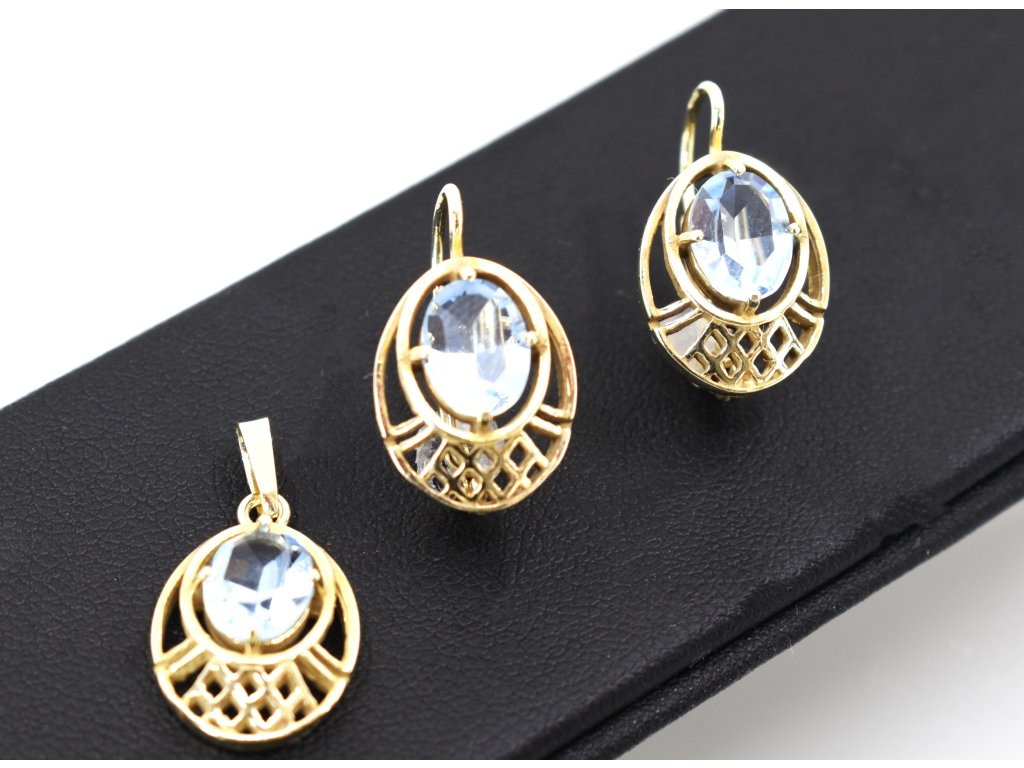 Luxusní zlacený set s modrým oválným zirkonem. Elegantní design, vysoký třpyt a bezpečné klapkové zapínání.