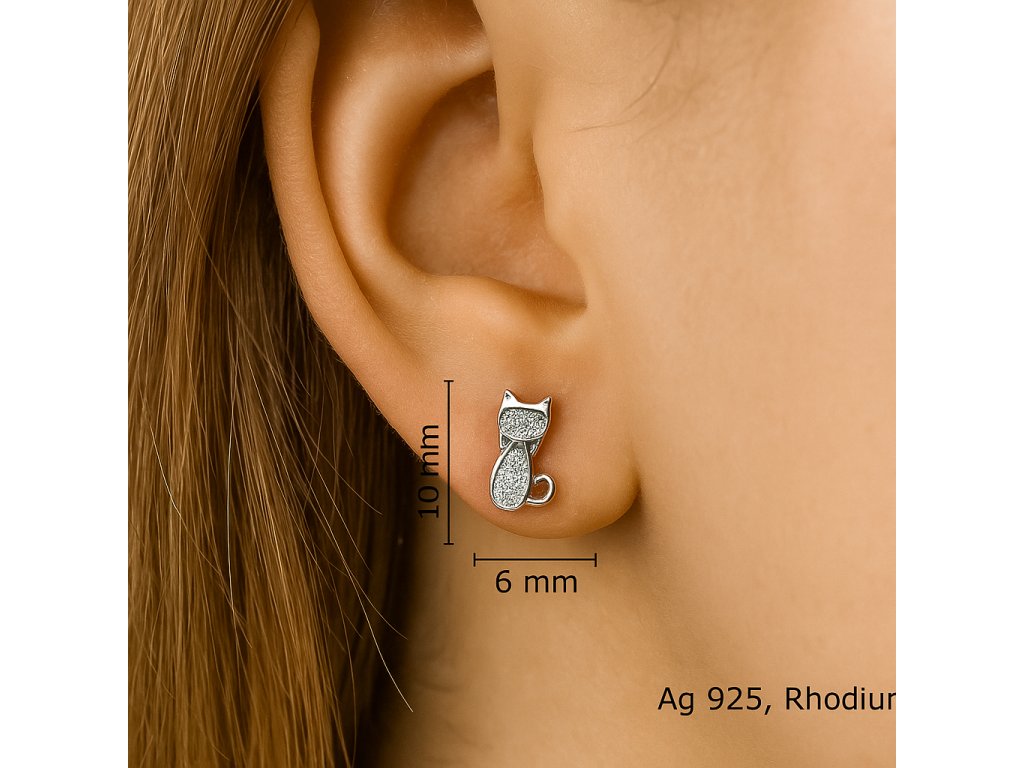 Stříbrné náušnice kočičky se zirkony – jemné puzetky pro něžné ouško (Ag 925, rhodiované) jemné puzetky s motivem kočičky, rhodiované, dárkové balení