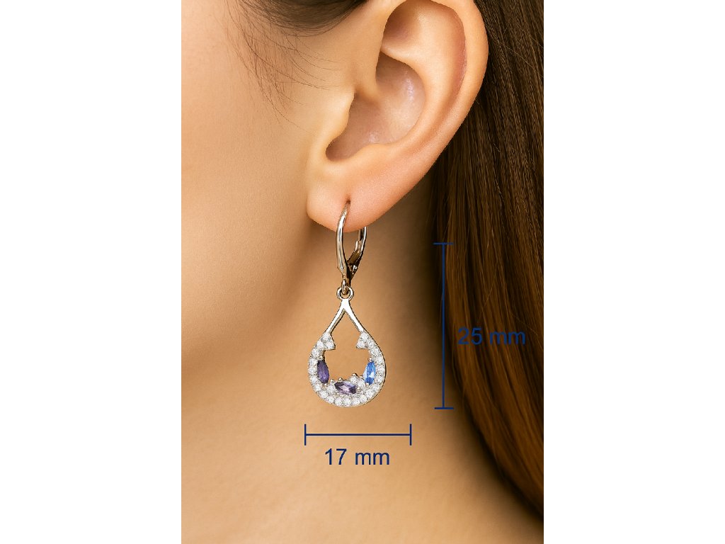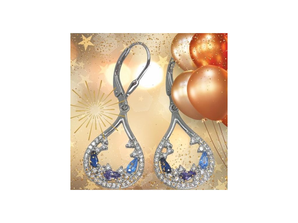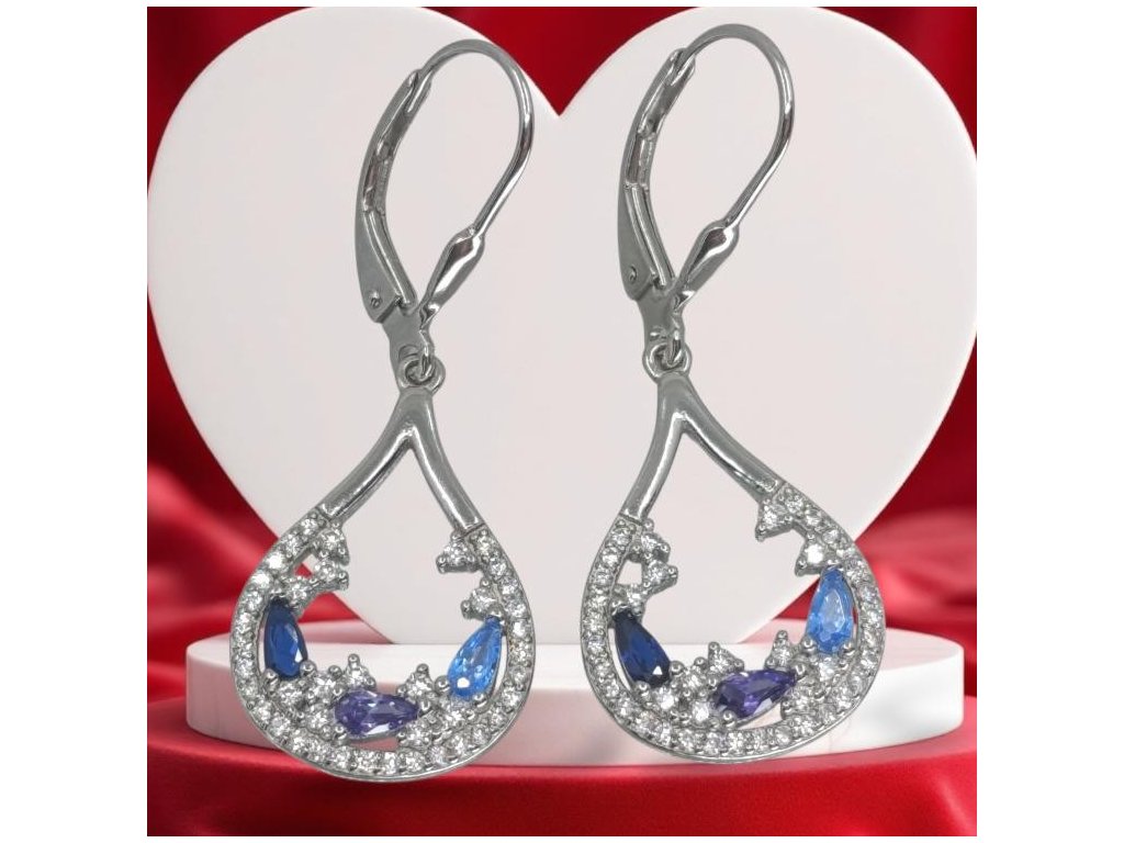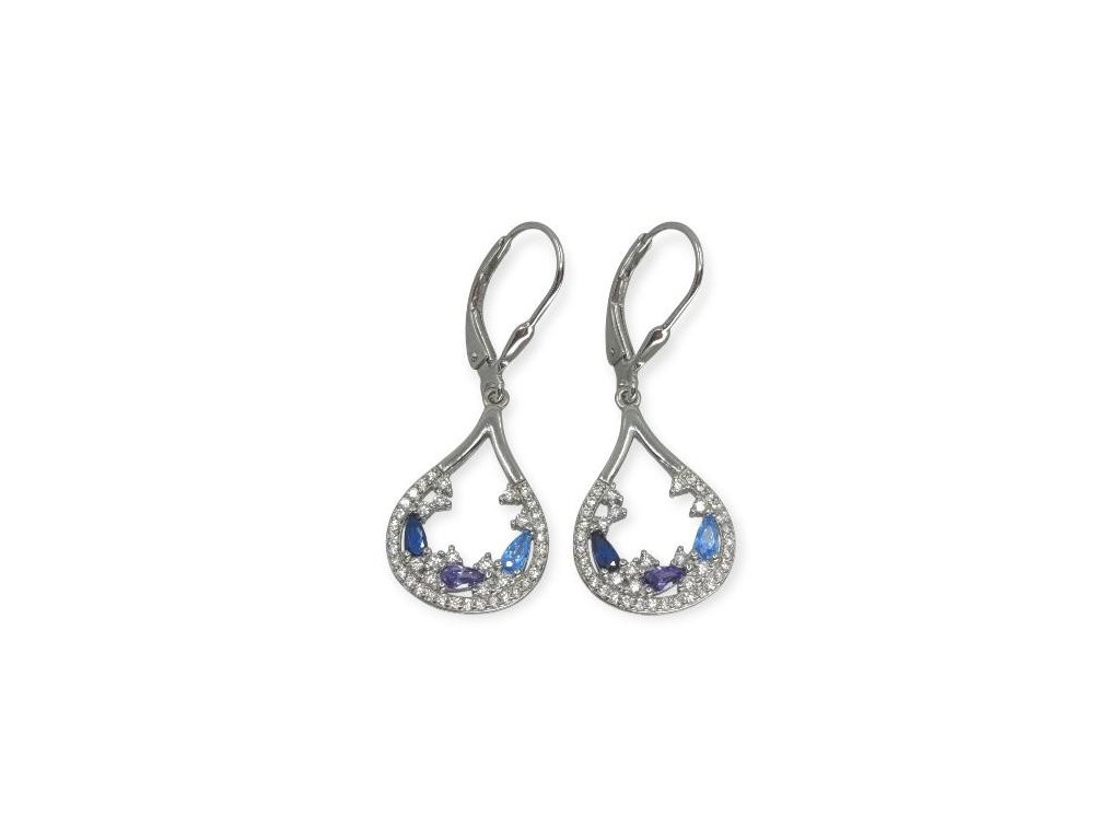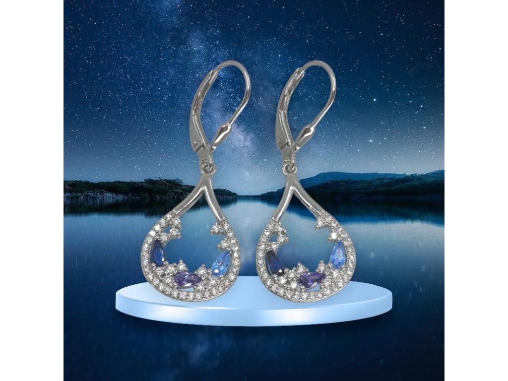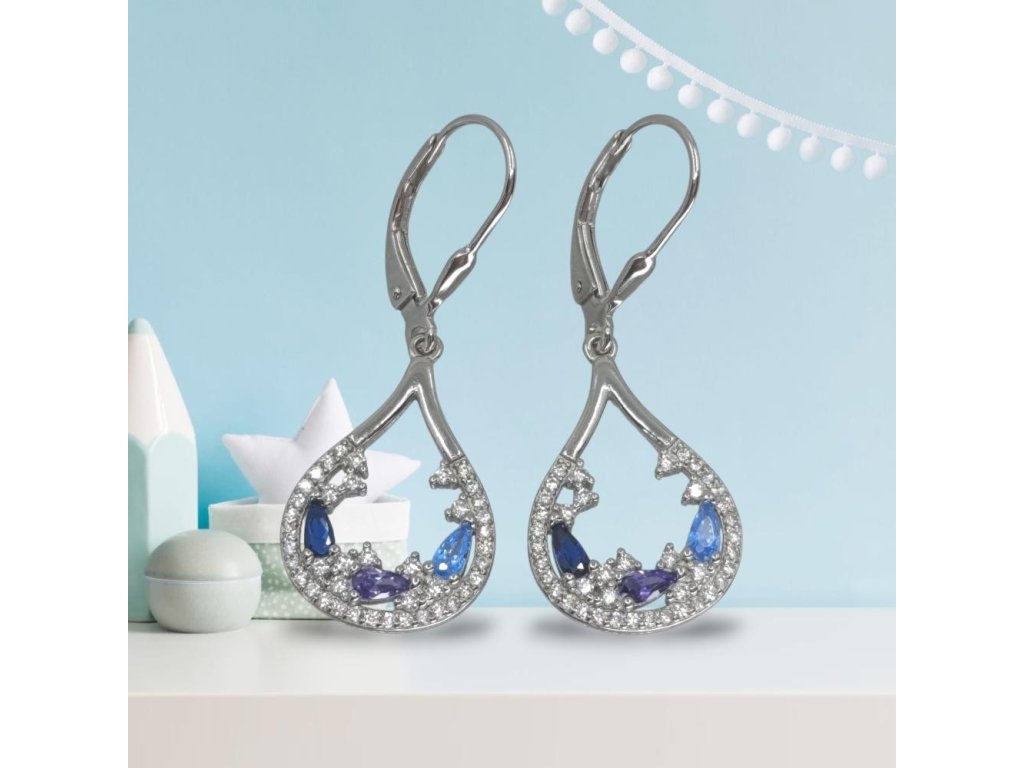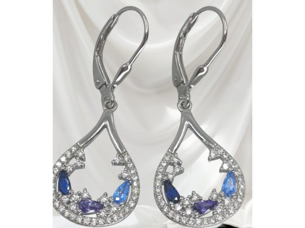 Elegantní stříbrné visací kapky s krajkovým osazením. Světle/královsky modré a fialové kamínky + čiré zirkony, klapkové zapínání.