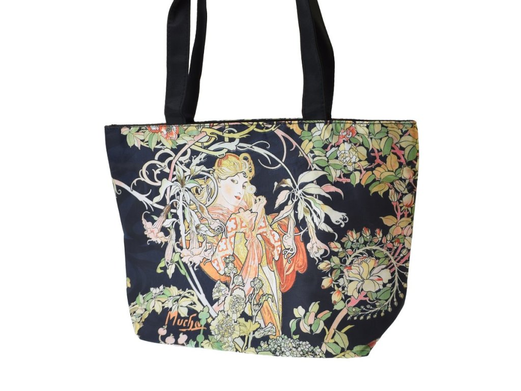 Taška přes rameno z produkce Carmani® na motivy Alfonse Muchy v černém provedení. Zrovna tuhle tašku zdobí krásný motiv, který si oblíbí každá žena, dívka ráda ji zařadí mezi své oblíbené kousky na cestu svým životem. Krásný dárek, nejen pro milovnice umění.